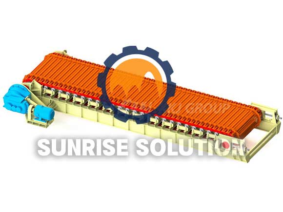 Heavy duty apron feeder is a large machine that carries materials through the parts of a manufacturing or industrial process. These machines resemble short conveyor belts, and may also be known as plate feeders or apron conveyors. Apron feeder machines allow engineers and process managers to automatically control the volume of materials that are added to a process, and regulate the rate at which these materials are added. To withstand the heavy weight of these types of materials, the belt portion of the apron feeder is made from thick steel trays, pans or caterpillar chain plate. Chains along either end of the feeder help move the trays along the conveyor area, and are powered by an industrial motor or engine. In mining, the apron feeder carries rocks and minerals for crushing, or further processing.