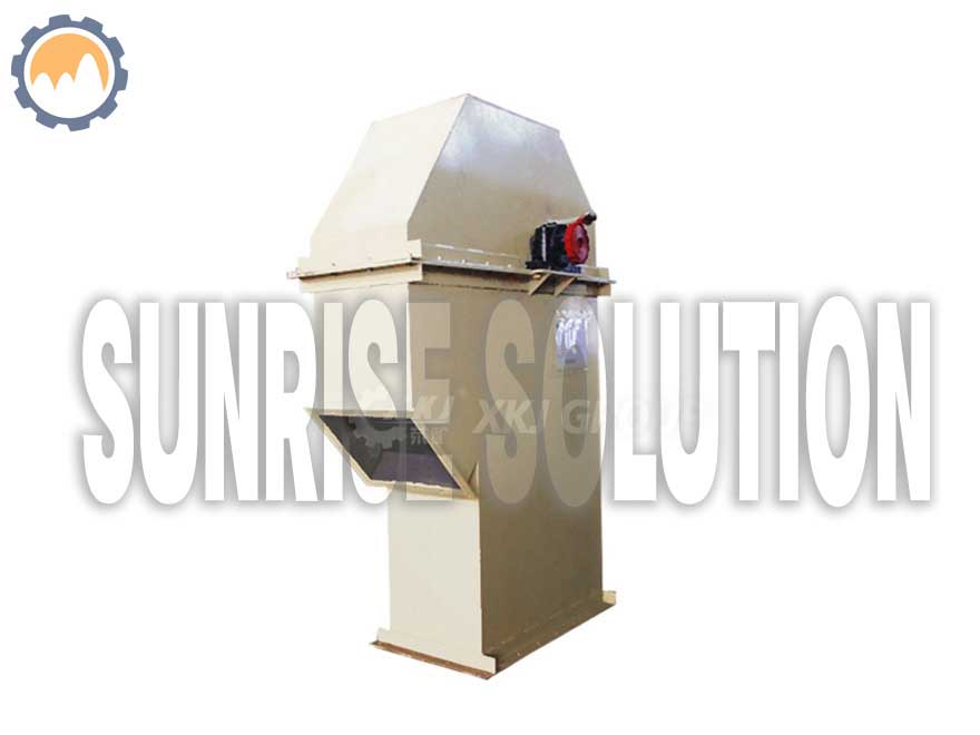 The materials are scooped up by the hopper and brought to the top along with the conveyor belt or conveyor chain, and then the materials will roll down after bypassing the top wheel, and the bucket elevator will pour the materials to the receiving chute. The driving belt of bucket elevator with driving belt often uses rubber belt which is installed on the upper or lower transmission drum and the upper or lower redirection transmission drum. Bucket elevator with chain drive is often installed with two parallel transmission chains, and there is a pair of transmission sprocket on the lower or upper part and a redirection chain wheel on the upper or lower part. Bucket elevator is often installed with enclosure to avoid dust pollution.